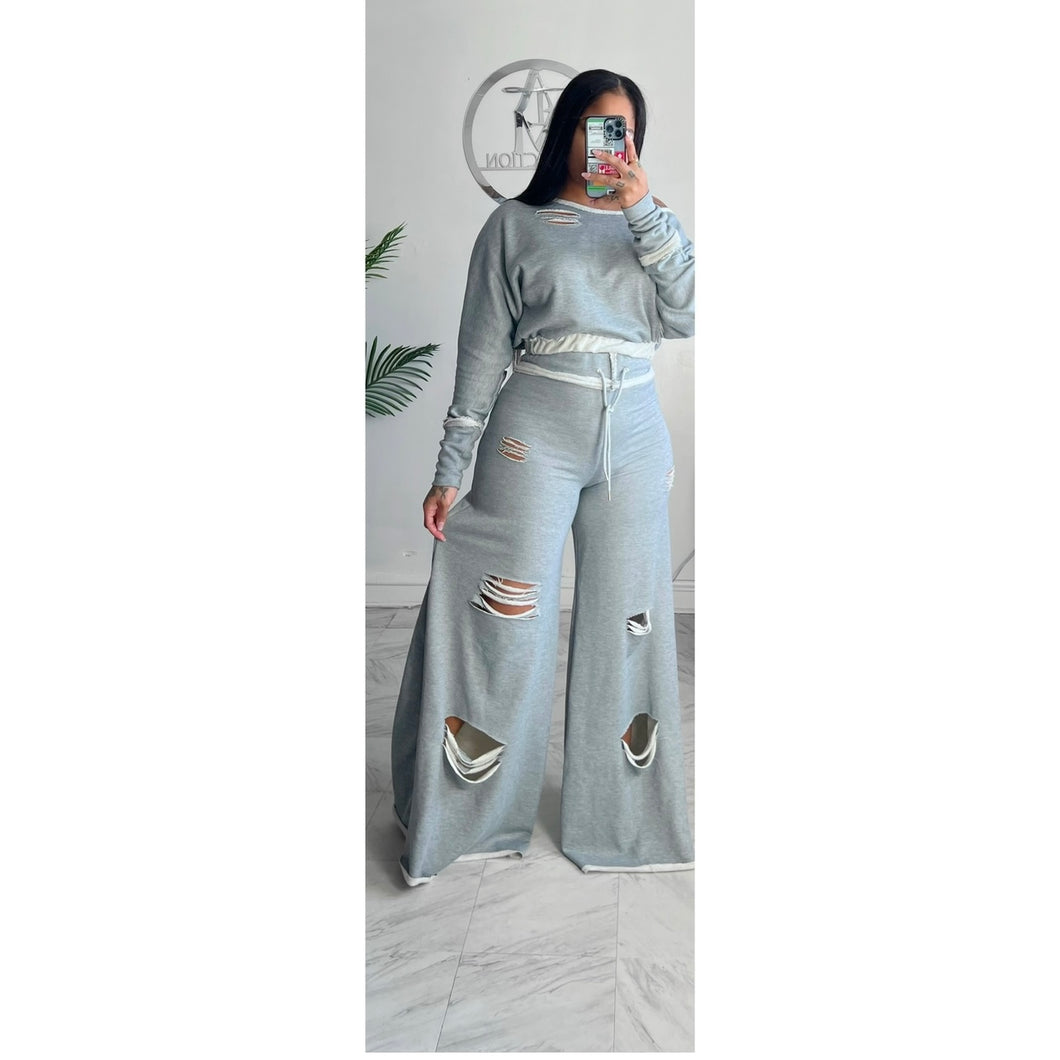 This set is made out stretch French terry fabric, they’re high waisted with a 2 in waist band. The neckline and hem line has a raw cut hem detail.